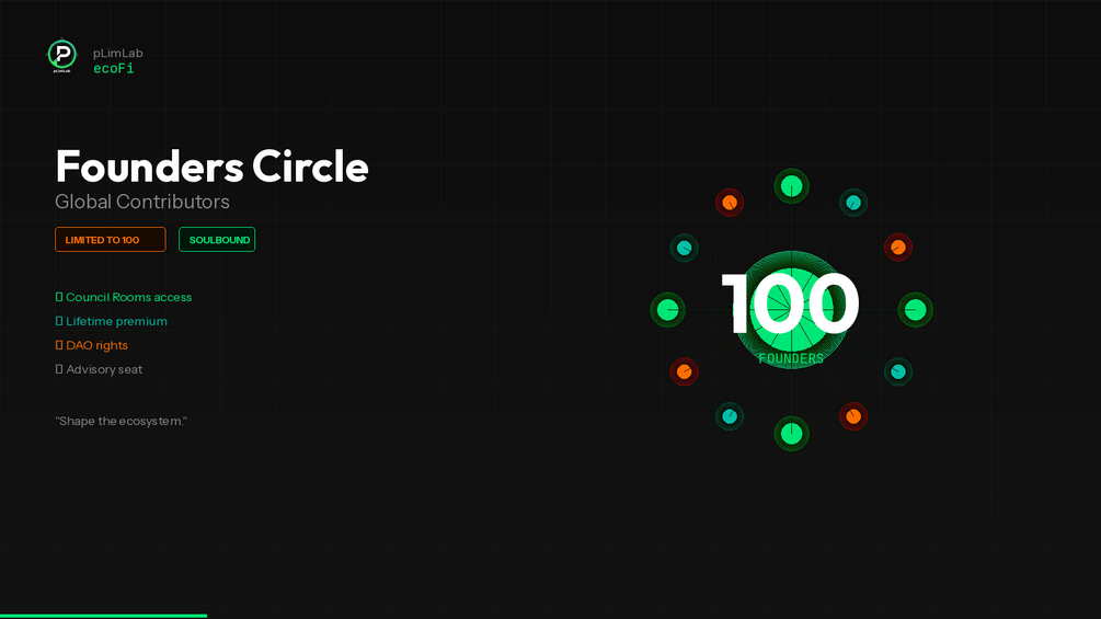 Un NFT exclusivo otorgado solo a 100 individuos seleccionados a mano para co-crear cada capa de ecoFi — técnica, humana, económica, social y estratégica.