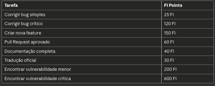 Este NFT permite participar do sistema de contribuição gamificado: complete tarefas, submeta pull requests, encontre bugs, escreva documentação, e ganhe FI Points por cada contribuição aprovada.