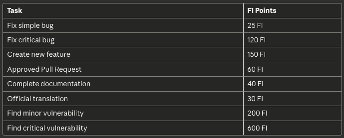 This NFT enables you to participate in the gamified contribution system: complete tasks, submit pull requests, find bugs, write documentation, and earn FI Points for every approved contribution.