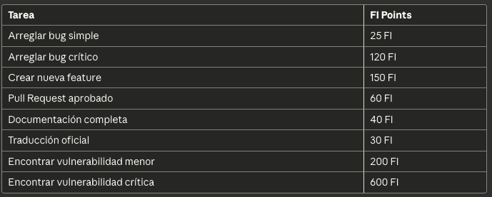 Este NFT te permite participar en el sistema de contribución gamificado: completa tareas, envía pull requests, encuentra bugs, escribe documentación, y gana FI Points por cada contribución aprobada.